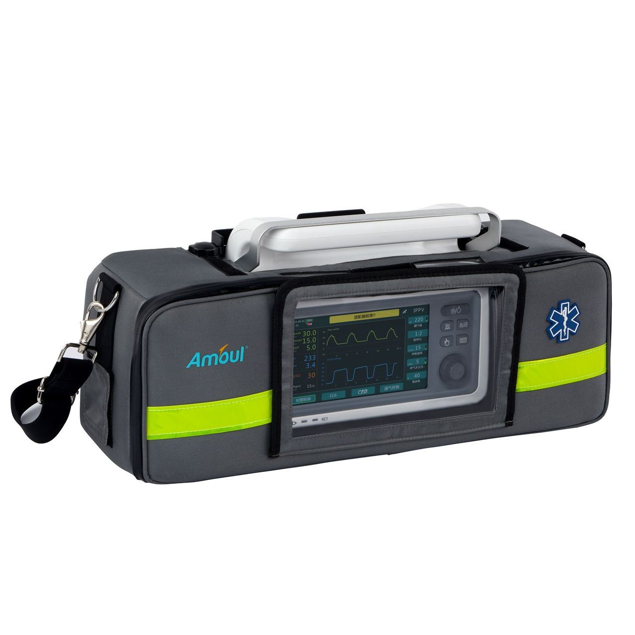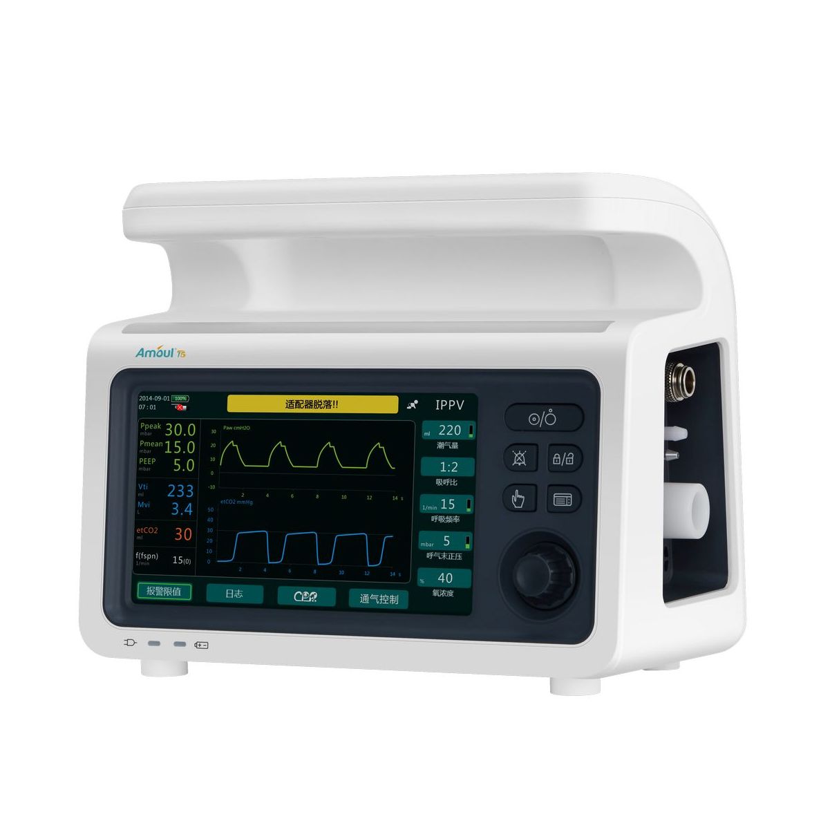 Большой дисплей (7 дюймов) данного оборудования может отображать параметры дыхания пациента и кривые. Большой дисплей данного оборудования также имеет сенсор, что позволяет управлять оборудованием посредством прикосновения.